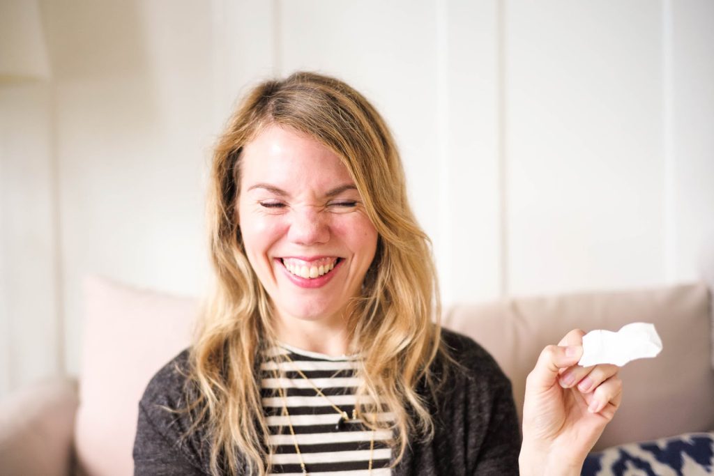 Now that my T-zone is as clean as can be, time for the Bioré Witch Hazel Ultra Deep Cleansing Pore Strip. I’ve been using Bioré pore strips since I was in high school, and I have yet to find a better way to get the gunk out of my pores at home. Here’s how it works: after cleansing (and toning, which we’ve just done), take the strip out of the package and wiggle it a little back and forth to loosen the slits. Then, make sure your nose is really wet so the strip can adhere to your skin and suck out all the nasty stuff. After drying your hands, remove the clear backing and press the strip onto your nose, smoothing out any bumps. Then, entertain yourself for 15–20 minutes while Bioré’s C-bond technology works like a magnet to lift dirt, debris, and blackheads from your pores. Then comes the fun part: taking the strip off and being equally grossed out and fascinated by what just came out of your nose.