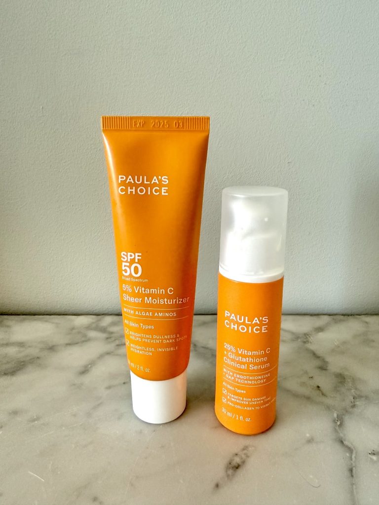 If you want to step things up a bit, my next recommendation is Vitamin C, which is an active ingredient (e.g. it’s more specialized) for brightening and evening out your skin tone. A lot of people find Vitamin C to be irritating, so I recommend easing into it gently. The Super Boost Moisturizer (not pictured, but I’ve gone through an entire bottle and can enthusiastically recommend) is a great place to start, and I am also a big fan of the Eye Cream for brightening dark circles. You can also try layering on the SPF50 Sheer Moisturizer, which, like the regular moisturizer, only has 5% Vitamin C. I am really a fan of this one because it has a slight tint to it, so it doesn’t leave a white cast on your face. If you still want more brightening after all of this, Paula’s Choice just introduced a clinical-grade 25% (!!!) Vitamin C + Glutathione Serum. Full transparency: this is too intense for my skin and made my cheeks red and irritated, so proceed with caution if you have sensitive skin.