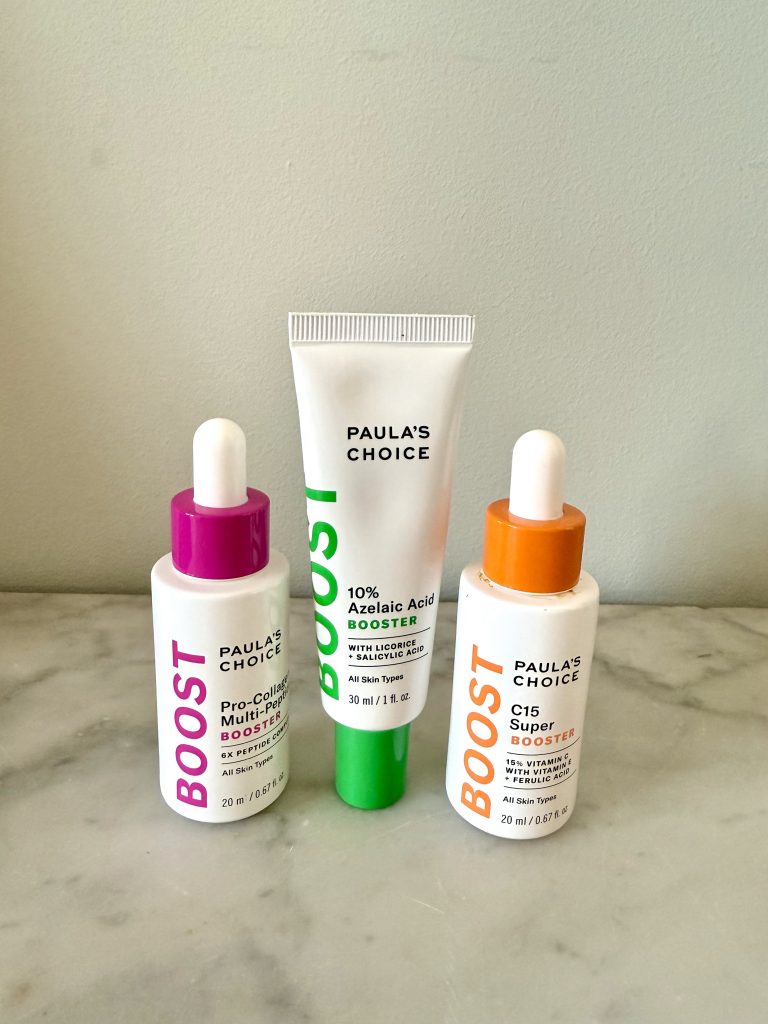This is also a category of products with active ingredients, and if I haven’t explained actives enough, basically they are ingredients that are scientifically proven to target a specific skincare concern. (Note that I didn’t say they correct it—that’s a medical claim, which only prescription-strength formulas can do. Skincare companies have all manner of ways to talk around this, hence words like “target” and “address,” which, yes, I just used.) Anyway, these are some of my all-time favorite Paula’s Choice products. I like to mix the C15 Super Booster (what I like to call the poor woman’s CE Ferulic) with the Pro-Collagen Multi-Peptide Booster, which is just an amazing all-around serum for plumping, smoothing, and firming. I’ve also been using the 10% Azelaic Acid Booster on my pores, which need all the help they can get, and I think it does make a difference in helping keep them less clogged.