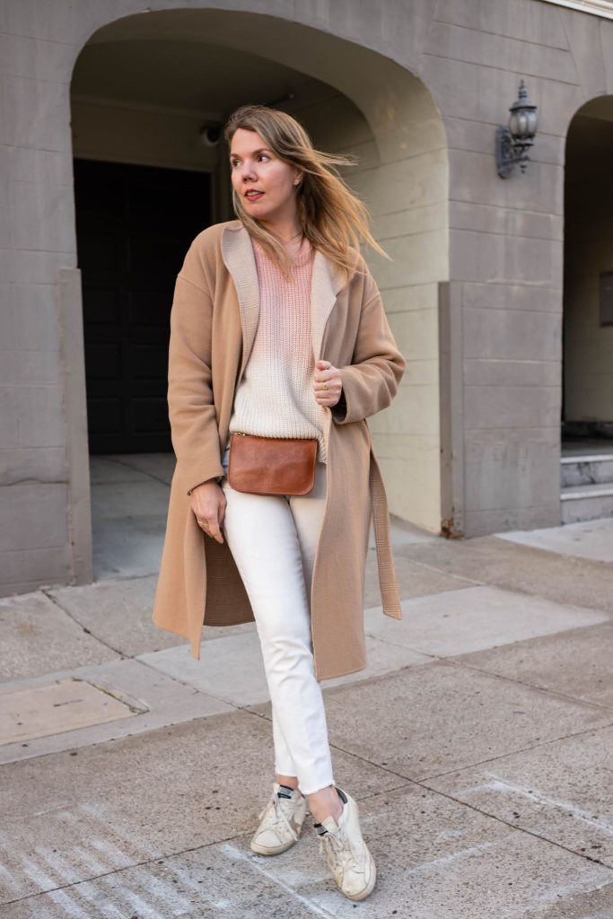 This outfit inspired my recent revelation that I was dressing like a sad, boring, middle-aged person and that I need more color in my life. The soft, pale colors and lightness of the palette here made me super happy (and I’m wearing the same sweater literally as I write this). Don’t be afraid to wear white jeans in winter—they look especially fabulous with a belted camel coat.