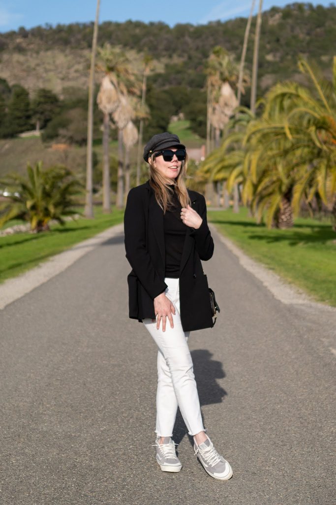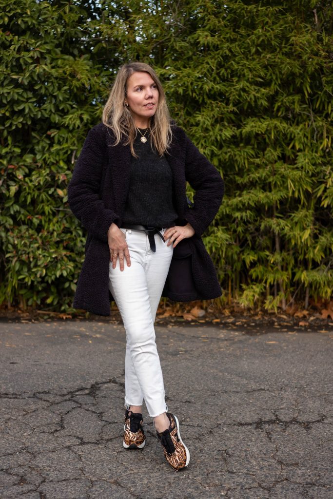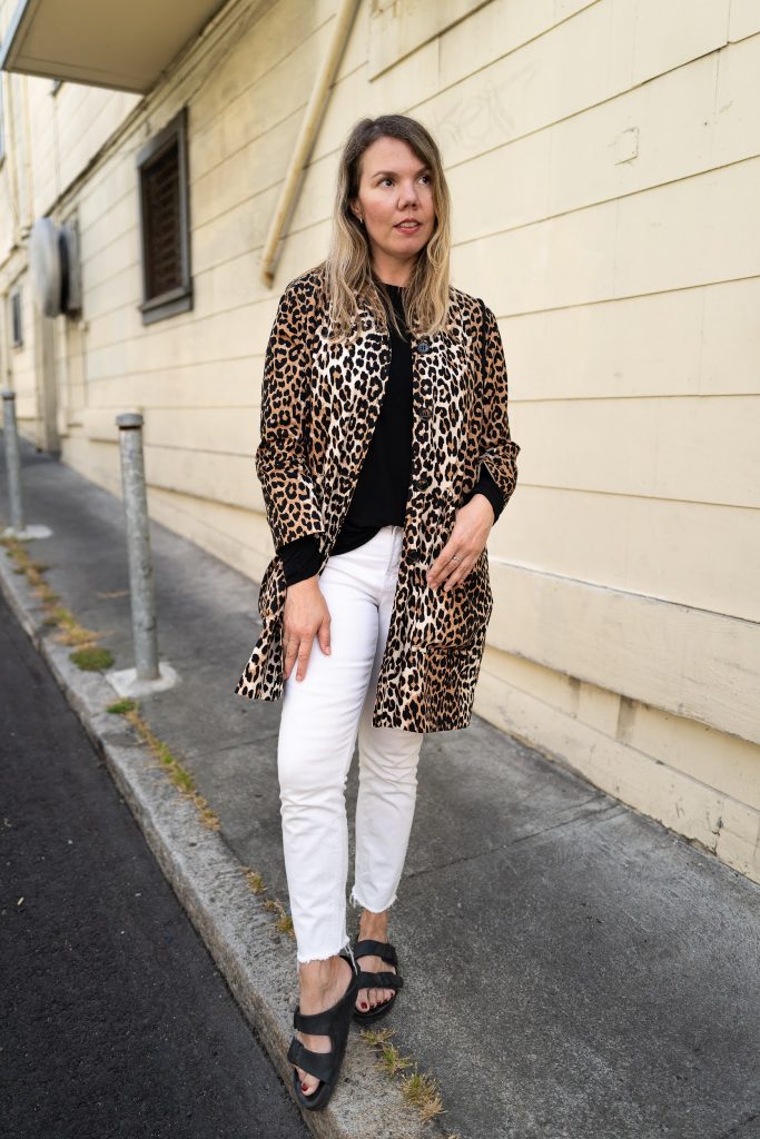 I truly think that leopard print looks good with everything, but I particularly love how crisp and clean it feels with white jeans. Believe it or not, this is considered a summer outfit in San Francisco (when the fog tends to make things unexpectedly cool), but this lightweight yet lined Ganni coat is perfect for spring and fall too.