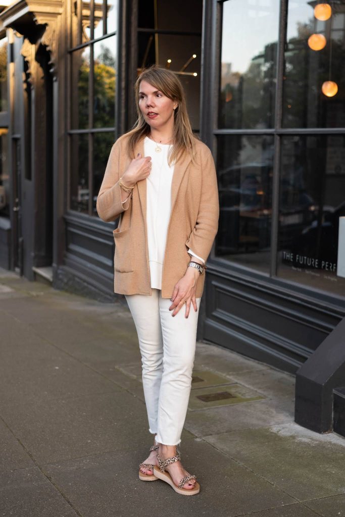 One of my favorite IG accounts to follow is Fashion Jackson, who manages to make neutrals look fun and accessible. I felt like this outfit was something she’d wear for spring. The top and the jeans don’t quite match, but who cares? The camel sweater blazer pulls it all together, and the leopard-print sandals add a little bit of fun.