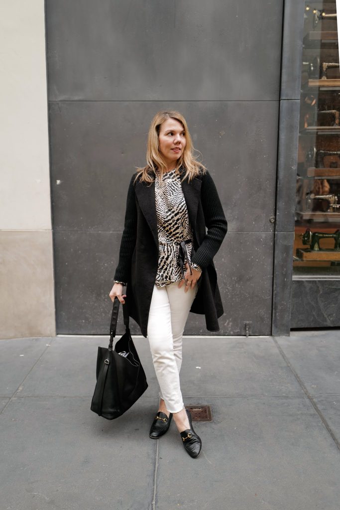 I haven’t worn this blouse in ages, because it qualifies as one of my fancier work tops, but it’s hanging in my closet, ready to be back on the job. This is also a great transitional look—the coat, which I haven’t worn much recently, since it’s also a little dressier in feel, is the perfect weight for late spring and early fall. And I love how my black Gucci loafers really pop against the bright white jeans.