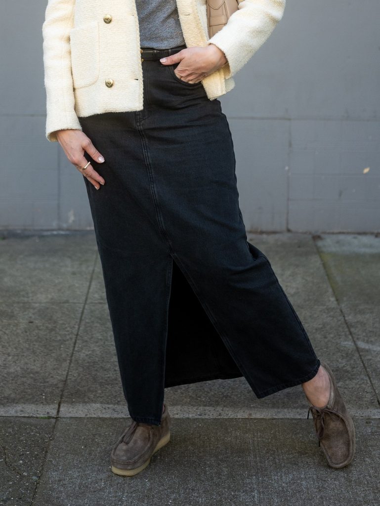 This trend has been around for a couple seasons now, and I needed time to sit with it before I committed. I had a Diesel denim maxi skirt in the late ’90s–early ’00s that I wore quite a bit (I will have to dig it out of storage and see if it still fits! Although probably not!), so this time around, I went with a black wash, which felt a little more grown-up and elevated to me. Again, you could argue that a denim skirt is more of a classic versus a trend; I generally stay away when things I wore in my youth come back around, but the shape and classic styling of this one still work, no matter your age. I managed to score this particular skirt on sale at Mango in NYC back in January (and I was thankfully able to fit it in my suitcase), but they have an almost identical one this season, and it’s available in a true blue too. I’m wearing a medium in this one also.