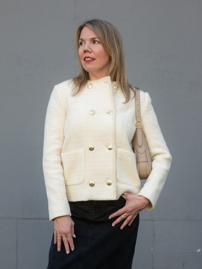Chanel-inspired tweed jackets are such a classic, you can hardly call them a trend, however they keep coming around in various shapes and forms. A few years back when we were all still wearing skinny jeans, a kind of oversized version was in style, but for whatever reason, it just didn’t work for me—I felt very matronly before my time. Granted, I’m a little older now, but I think what makes the current crop of ladylike jackets work is the cropped fit and more neutral color palette. I first tried this Ba&sh jacket on in NYC (clearly that trip was very influential for me this year!) but since my suitcase space was limited, I decided to order it online and have it shipped. This one has a pretty boxy fit, which feels very modern; gold buttons are another important element, and while Ba&sh makes a similar single-breasted style, I liked the double-breasted cut of this one for a little extra polish and glamour. As for color, I went with white versus black because really the last thing I need is another black jacket. But I think black would be a wise investment too. I’m wearing a medium in this style.
