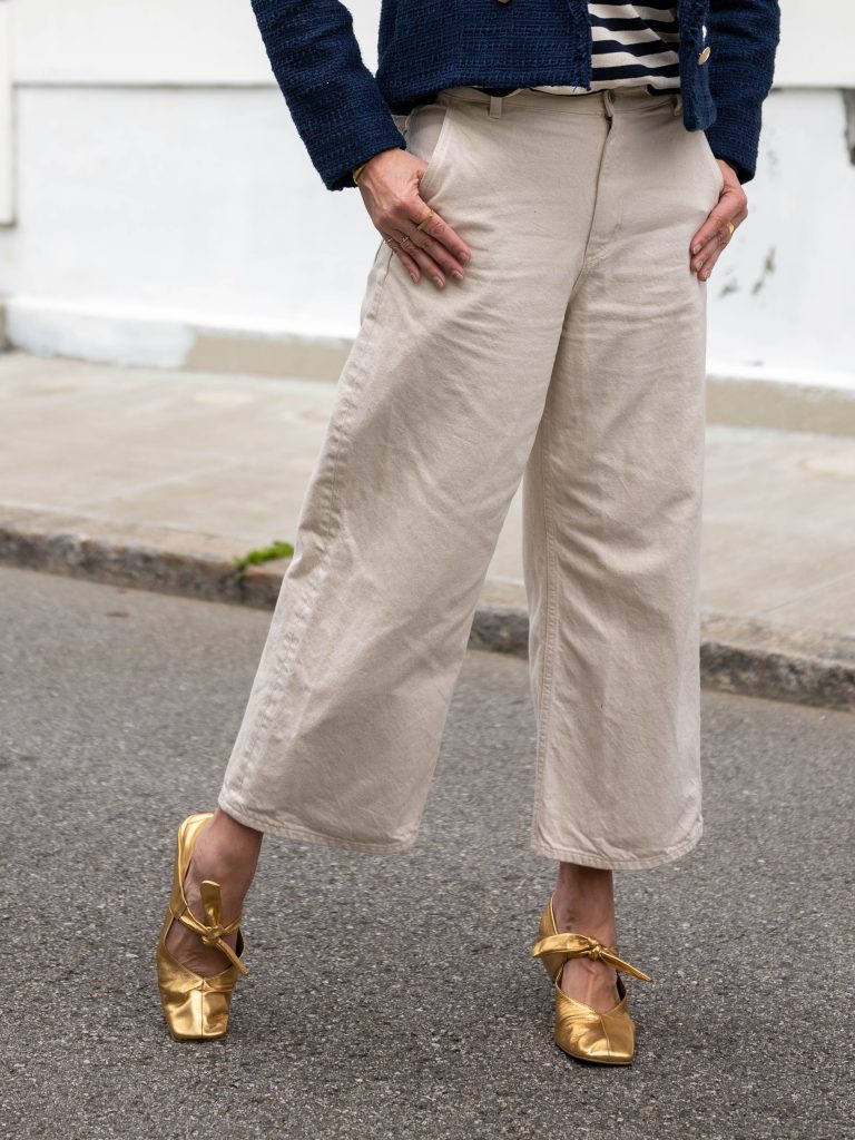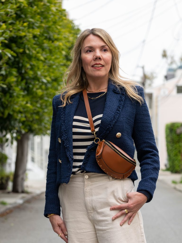 It seems like Chanel-style tweed jackets are everywhere this season, although, to be fair, they’re one of those items that never totally goes out of style—it just keeps coming back in slightly different iterations. A few years ago, I was after a longer, almost boyfriend-style version (I ended up with this one), but since we’re undergoing a pretty major silhouette shift at the moment, now I want something more cropped—the better to pair with wide-leg pants (more on that later). There are a lot of Chanel-style collarless cardigan jackets out there at the moment (we can thank Hedi Slimane and Celine for that), but I’ve found they make me look kind of matronly. I prefer a blazer with a lapel and a little shoulder padding, and Zara does a pretty good take on this. There are a lot of cheap, synthetic acrylic and polyester tweed or bouclé jackets out there; this one is 100% cotton and I was blown away by the quality. I’ve been trying to temper my Zara habit, and while they definitely have a lot of polyester crapola, you can find some diamonds in the rough if you look closely enough. I’m wearing my usual medium in both the jacket and the striped sweater, which is a nice, soft viscose blend. I know, stripes for spring aren’t groundbreaking, but lately I’m finding navy to be a little softer and and more flattering against my skin than my go-to black.