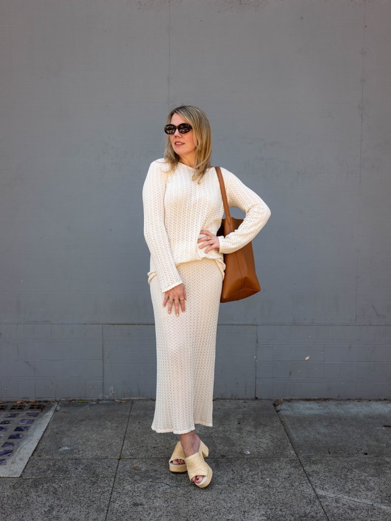 I have been very resistant to the idea of a matching set. Why not just buy a dress? Well, because you can also break the pieces apart and wear them with other things, making matching sets excellent for traveling. You last saw this skirt in my honest review of Spanx Thinstincts; I love it so much, I ordered the the matching top. While I wouldn’t normally go for a long-over-long ensemble, there’s something about this set that just works—I think because the knit is so lightweight and body-skimming, it doesn’t feel overwhelming. Both pieces are now on sale at Zara, making them even more tempting than usual. I’m wearing my usual size medium in both.