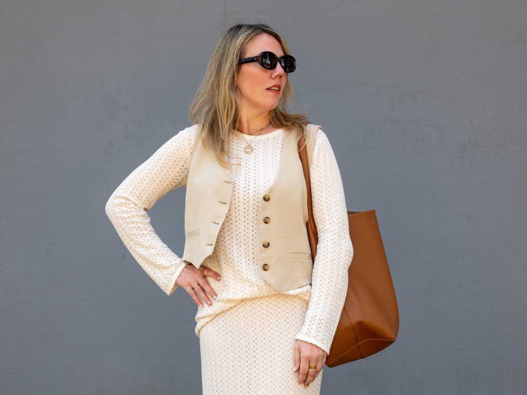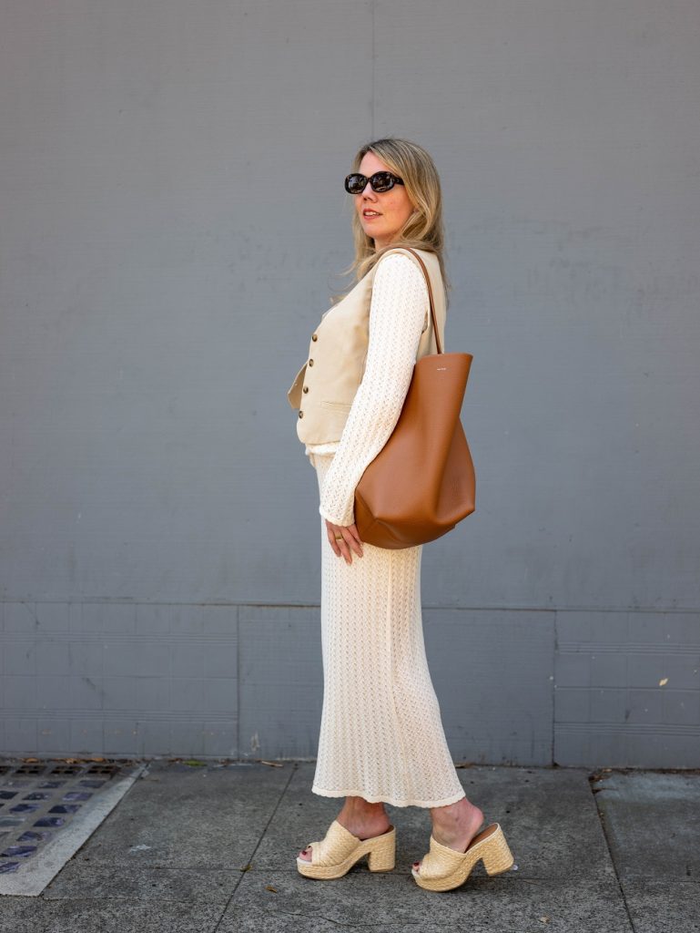 Add vests to my list of things from the ’90s that I never thought I’d wear again but here we are. What’s new this time around is that I’ve been seeing a lot of women on Instagram wearing a vest as a tank top, with high-waisted jeans or Bermudas, and I definitely plan to try that as soon as I’m in a climate that’s appropriate for a sleeveless top. In the meantime, I’m layering this vest (also a Zara sale find) on top of everything I can; I like how it adds a bit of structure against the slinky knit pieces I’m wearing. I also took a medium in this one.