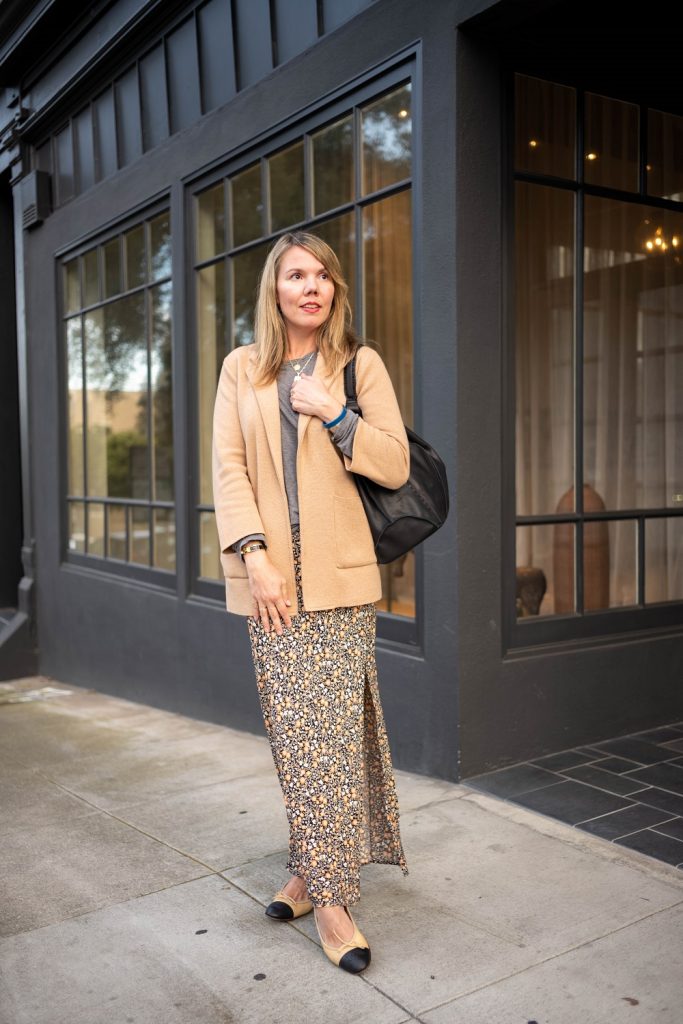 This is an outfit that you could definitely wear to the office (maybe with different shoes though), but it happens to be one of my favorite work-from-home outfits too. I sometimes struggle with maxi dresses and layering, because it can be hard to get the proportions right. While I tend to go for either very cropped or very long over a maxi, the in-between length works here with the more relaxed silhouette of the dress. Again, this is another super-comfy one!