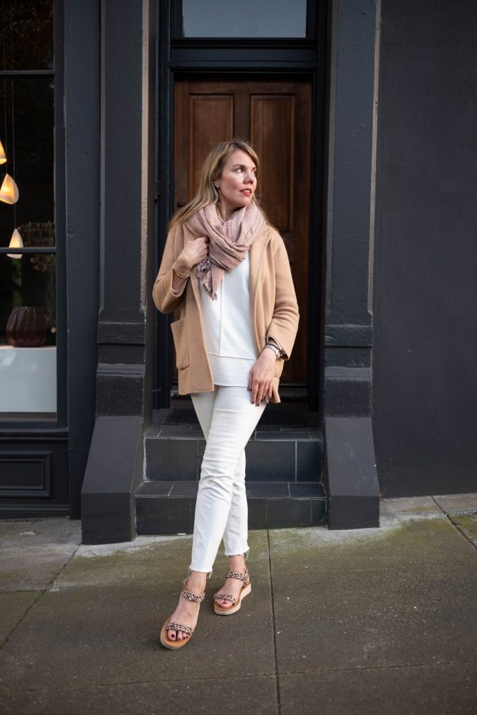 One of my favorite things about this knit blazer is that it’s so lightweight, you can wear it year-round. In the colder months, it’s an extra layer, but in the spring and summer, it functions as your outer layer. This time of year, I especially love camel with white and pink—it feels bright and hopeful, just like springtime.