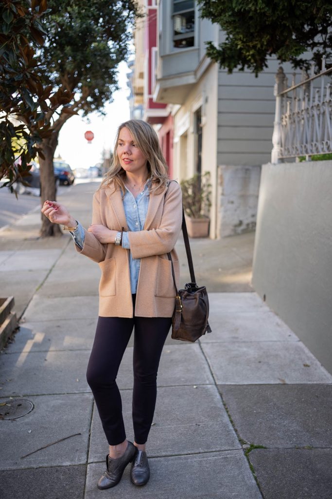 Skinny pants fans, this one’s for you. One of the many wonderful things about this blazer is its length, which, on me, is just enough to cover the derrière, something I prefer with my more formfitting bottoms. This particular pair of pants happens to be knit, however they have actual back pockets for a little extra coverage. What makes them genius is that they look like woven pants, but they’re just as comfy as leggings (here’s an in-depth review). If you’re wearing this combination to an actual workplace, I recommend layering with a woven shirt, as I have here, because three knit pieces together can skew a little casual (but keep scrolling to the bottom if that’s what you’re after).