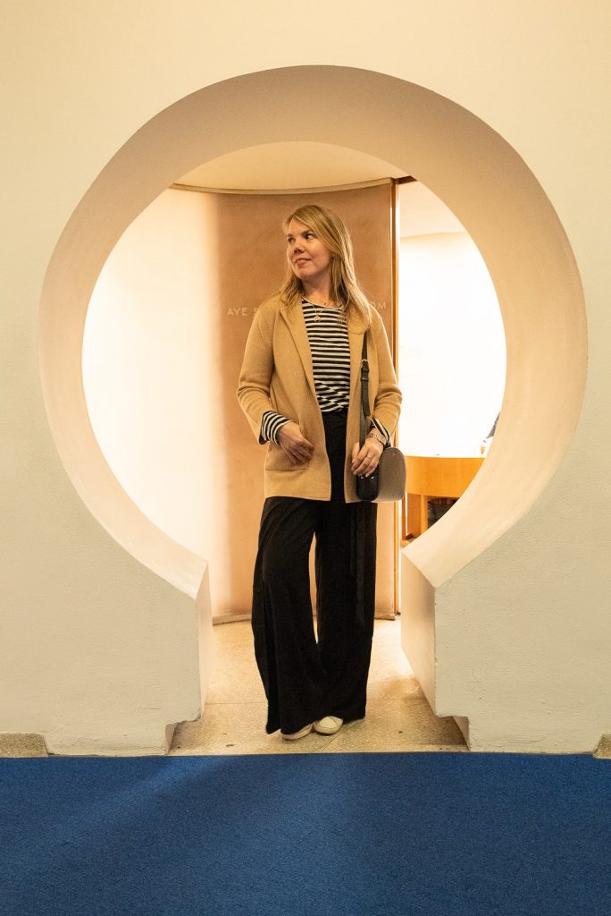 I absolutely loved this outfit—I was a little unsure about the wide-leg trousers, but when I got to NYC (where this photo was taken), there were so many women wearing them. Again, I wouldn’t instinctually pair such a longer, slouchier blazer with fluid pants like these, but with the pop of pattern from my striped top (and tucking it into the high waistband), there’s enough definition and differentiation for it to work. Best part: it’s super comfy too, especially with sneakers.