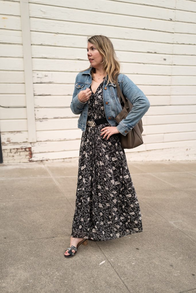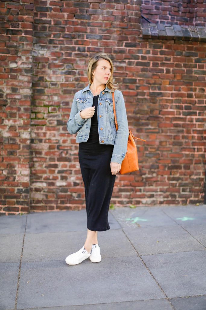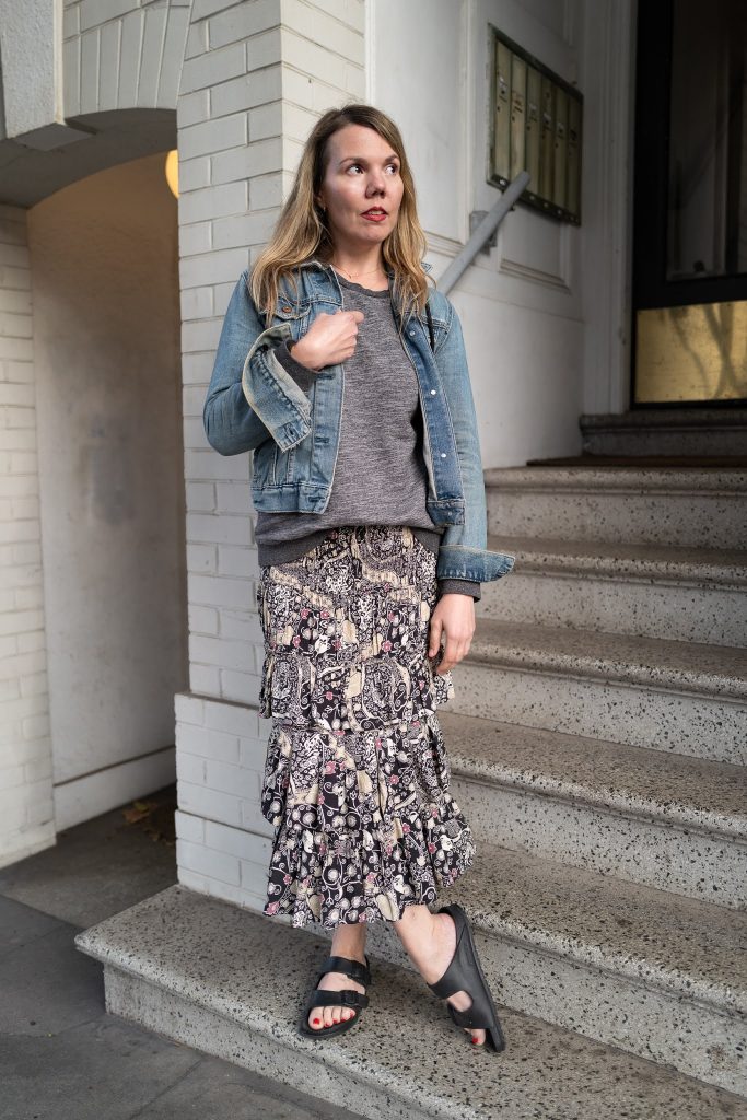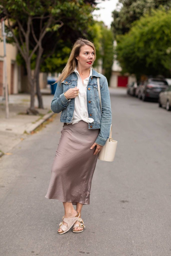 This was one of last year’s most popular posts, and it’s a very “me” look, from the midi skirt to the Birkenstocks. Again, the combination of the super-casual shoes and the denim jacket prevent this look from feeling too dressy (or boring).