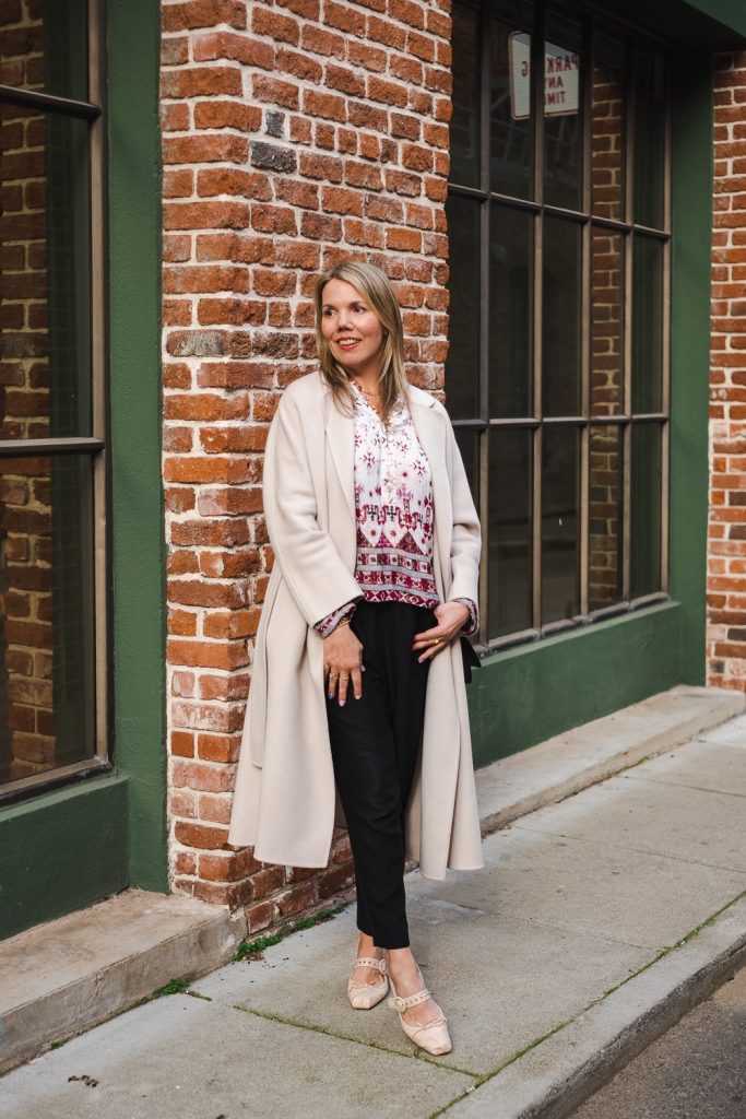We shot these photos on my birthday after we went out to lunch at Cotogna, one of my favorite restaurants in San Francisco. I was a little more dressed up than I’d normally be on the weekend, but I think it goes to show that going-out tops don’t just have to be for nighttime. As a nod to my college days, I paired my top with some black pants, although you’ll notice these are high-waisted and straight-leg, not low-rise and bootcut! A few more upgrades to note: my Loubs, my Chanel WOC, and my favorite Max Mara coat, which I definitely would not leave on the floor of some fraternity house coat room, like I did with my puffer jacket in college (sorry, Mom!). But the best part is that I never come home smelling like smoke nowadays. Growing up is definitely a good thing.