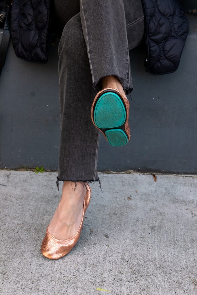 The shoe itself is very minimal by design, with no embellishments other than a turquoise strip along the heel. Elastic runs along the edges, except at the back, which thankfully has a cushion, so your achilles doesn’t get crushed. Except for the vegan options, the uppers are made from a single piece of leather; the insole is hand-stitched leather with light foam cushioning, and the midsole is also leather—something you don’t usually see. The most unique feature of Tieks, of course, is the bright turquoise blue split sole, which is super flexible and allows for the shoe to be folded in half. Each pair comes with a black compression pouch, which is roughly the length of your palm and lets you store your flats compactly (mine weigh 12 ounces in the pouch), as well as a turquoise folding tote where you can stash your other, less comfortable shoes when it’s time to change into your Tieks. The flats come in all manner of colors and patterns, from classic solids to textured animal prints and metallics; I went with Rose Gold Glam from the Old Hollywood collection. Prices range from $185 for the solid-colored classic and vegan styles, and can run up to $345 for the more intricate printed styles. All shoes are available in whole sizes 5–13(!).