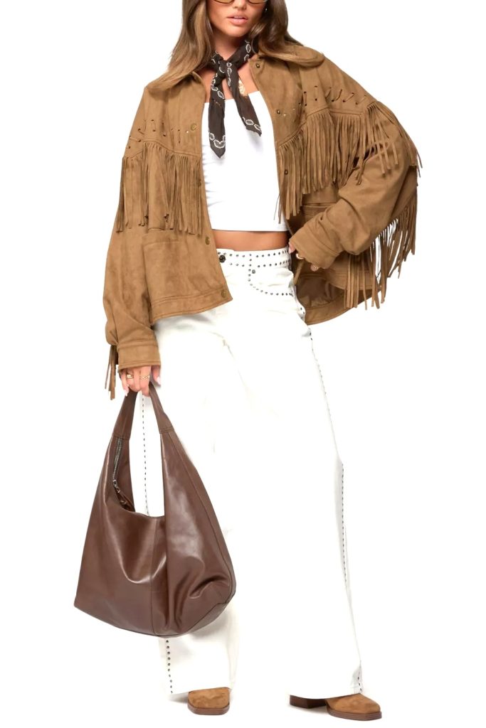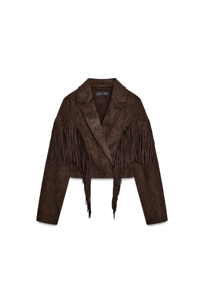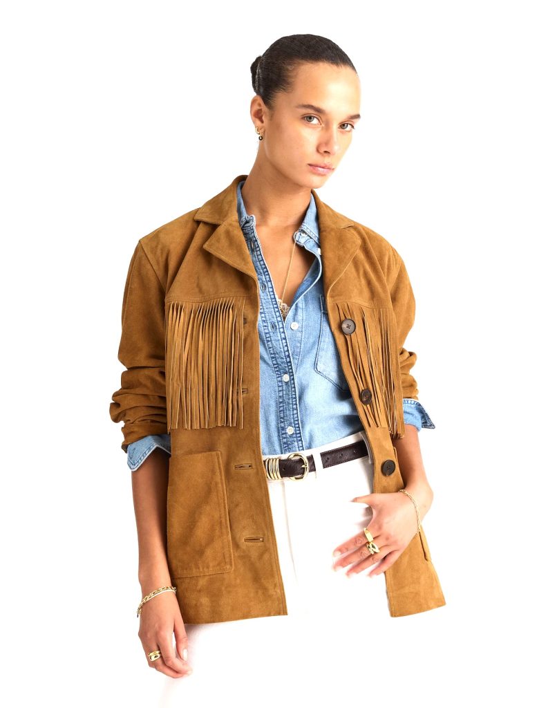 2.While I’m generally not a fan of faux animal hides, I wanted to include a few faux suede options here for price sensitivity and because real suede can be challenging to care for. But this jacket is so unique, I would have included it regardless—it’s definitely the most ’80s-inspired option here, but in a more refined way than you’d expect. I love the placement of the fringe and the cropped fit.