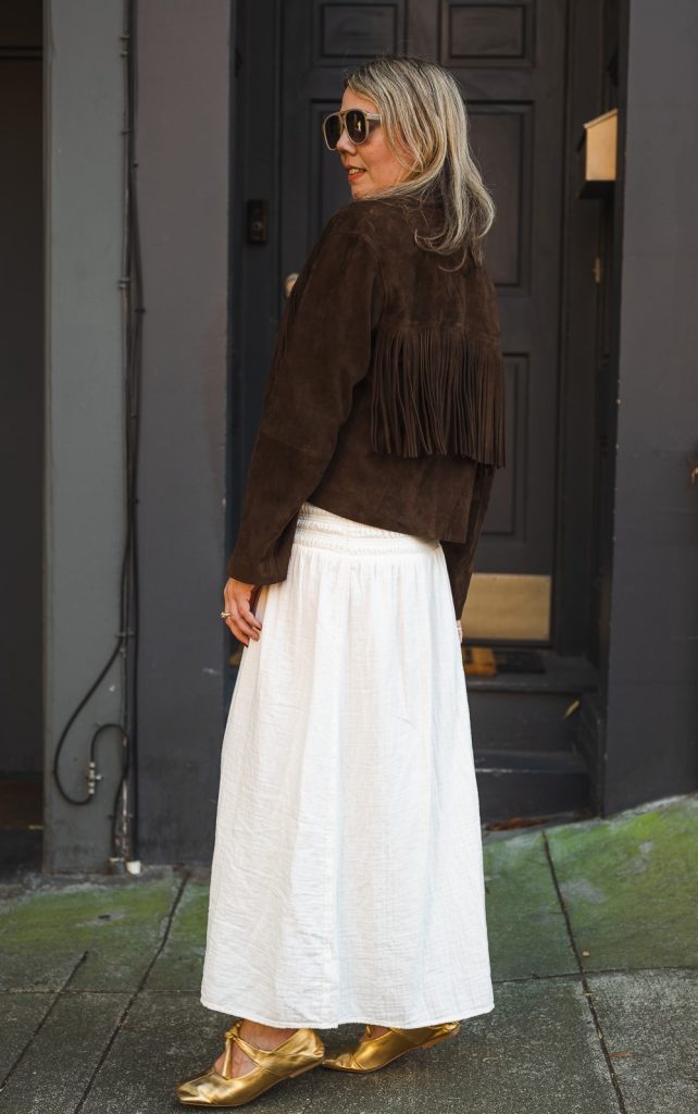 While I ideally wanted a vintage fringed suede jacket, I found most of what’s out there to be rather stiff and heavy, so I then honed in on a Massimo Dutti jacket, which I featured in my birthday wishlist earlier this year. That jacket was originally $590, so I added it to my shopping bag then waited (and waited and waited) for a sale. Long story short, my patience paid off and I finally scored it for 60% off in July. The wait was worth it; this jacket is buttery soft and the cropped fit is chef’s kiss. It’s finally getting cool enough to actually wear it, and while I love the more transitional way I’ve styled it here, I can’t wait to pair it with high-waisted wide-leg jeans and a great pair of boots. This exact jacket is sadly long gone, but read on for more great options.