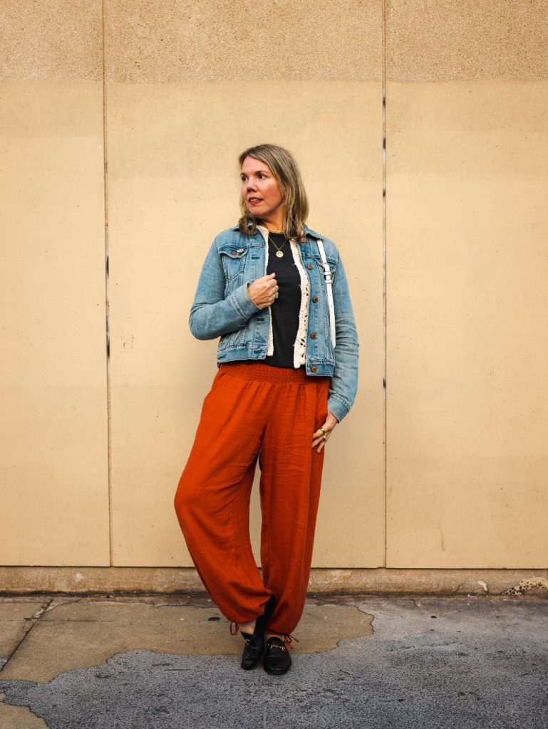 Harem pants have come and gone in and out of fashion several times over the years; I feel like we may have recently had a drop-crotch moment about 14 or 15 years ago but not a full I Dream of Jeanie harem pant moment. I started to notice a few of my favorite forward-thinking bloggers like Leandra Medine wearing them recently and wasn’t actively seeking a pair until I was on Old Navy’s website to buy the baggy denim shorts (also a trend!) I featured a couple of weeks ago. The shopping-cart algorithm surprised me by suggesting a pair of harem pants and since they were half off at the time, I thought why not? In spite of the fact that the rusty color is not one I’d normally gravitate toward, I took a chance and you know what? I love these pants. I was worried that the amount of fabric would be overwhelming, but it’s not at all—the wide ruched waistband plus the tied ankles keep the silhouette under control. Pants this comfortable should not be so flattering, but they are. I’ve worn them out three weekends in a row and have a feeling they’re going to be one of my favorite pants of the season. And I’d never know if I hadn’t tried this trend on for size. Speaking of which, size down in these—I’m in a small.
