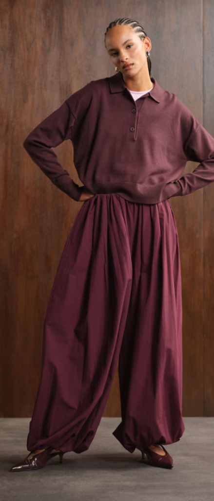 6.To be honest, I kind of forgot about ASOS, but here they are with a very voluminous pant in a really rich plum color. These might be pushing it in terms of shape—there’s a lot of fabric in those legs—but sometimes you just have to make a statement.