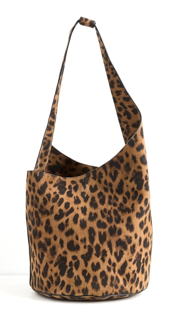 I’ve said it more than once and I’ll say it a thousand times: leopard print is a classic. So it’s perhaps a bit disingenuous on my part to call leopard print a trend, but what’s trending about it for me at the moment is a particular accessory in a specific shape: a slouchy bucket bag. There are several really, really good ones out there right now, but before I get to them, I wanted to give a shoutout to my Clare V mini tote, which has been with me for years. She still makes the larger version of the bag in a slightly different print, and if you’re ok with a handheld or crook-of-the-arm tote, it would make a fantastic work bag. But for the rest of these, the shape I’m after is a shoulder bag with a more elongated silhouette. Read on for my favorites of the season.