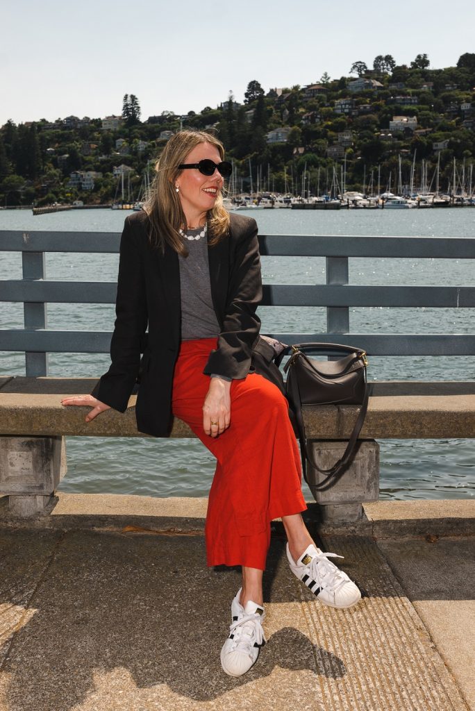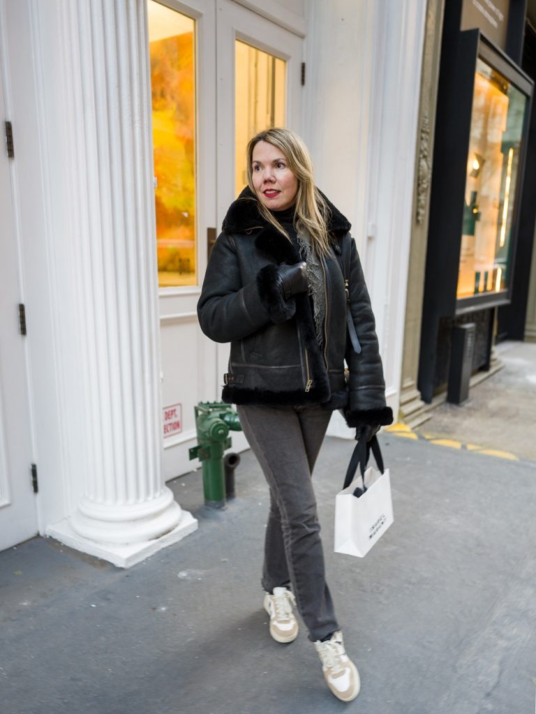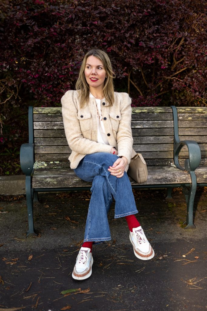 I love pretty much everything I’m wearing in this outfit, including the glittery red socks, but I truly get a lot of wear out of this wool shirt jacket. The shoulder pads are a bit exaggerated, but as someone with narrow shoulders, I’ve found them to do great things for my proportions. I took my larger Isabel Marant size (a 40) in this one, and for the record, I’ve decided the Celine bag and the Chloe sneakers are not for me—look for them on The Real Real soon.