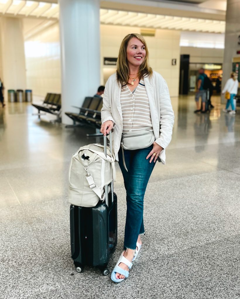 I have a go-to airplane outfit, which is usually blazer + long-sleeve tee + jeans + sneakers. I modified it slightly this time, layering a lightweight sweater under my blazer because I didn’t have room for it in my luggage (!) and switching out my sneakers for Birkenstocks, because the latter actually took up more space. Pro tip: to save space in your suitcase, wear your bulkiest items on the plane. You can always remove your layers if you get too hot.