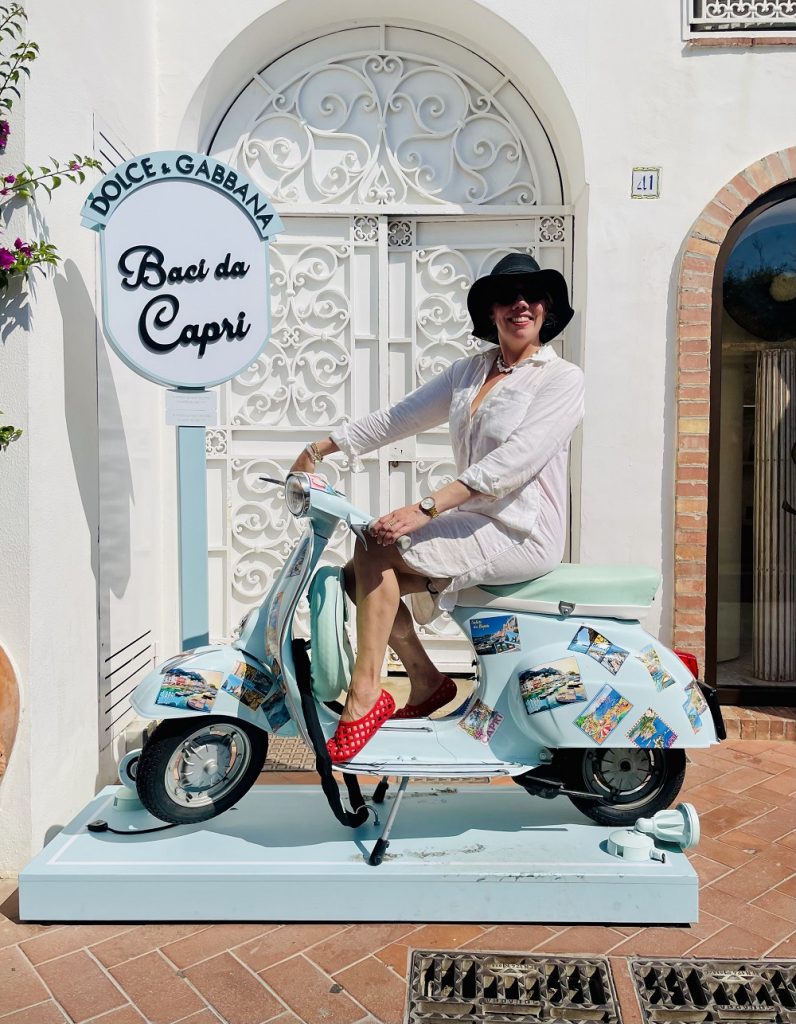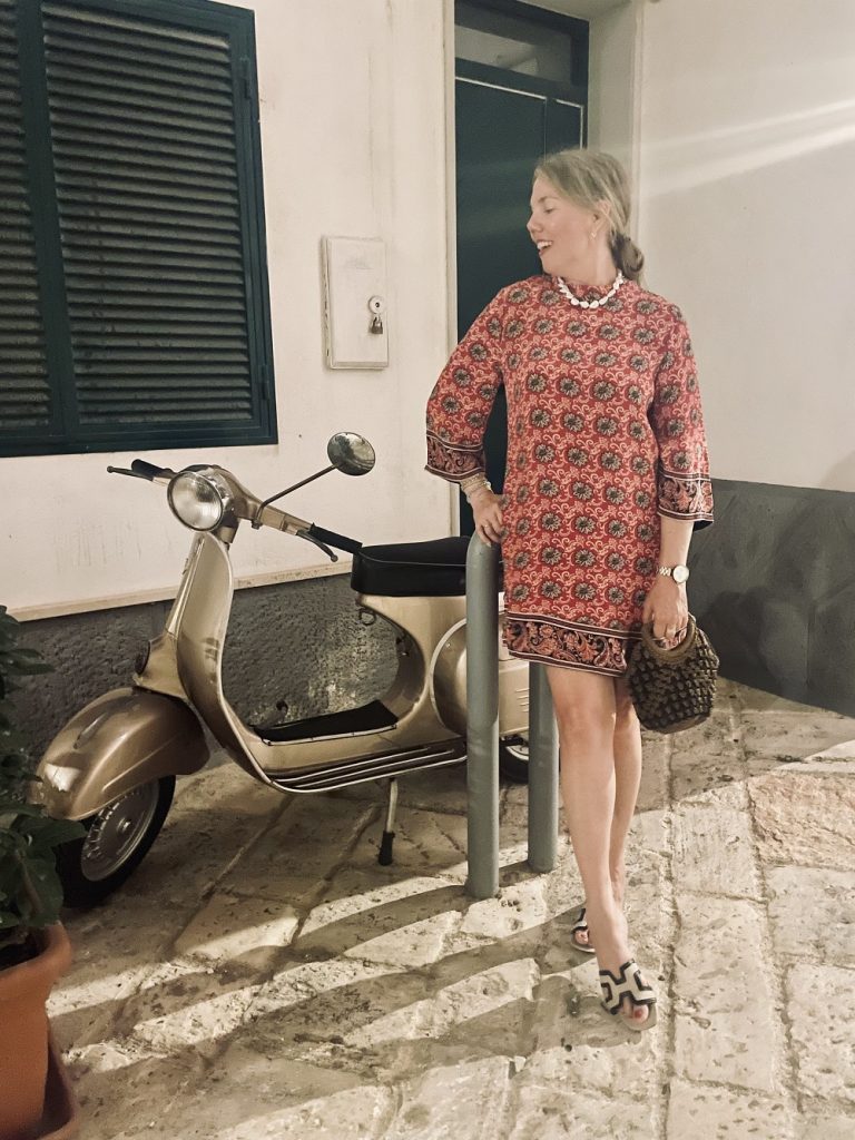We spent most of the day on a boat, so I am actually wearing a swimsuit under this linen dress, which I’ve had for a gazillion years (I think it’s at least 10 years old). This was also the only day I wore these shoes—they are comfortable but not great on cobblestones. Also, I should note: you’re not supposed to sit on this Vespa—there’s a subtle sign, which I missed—but thankfully no one yelled at me!