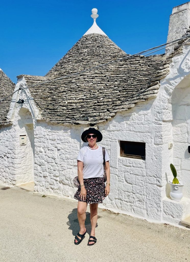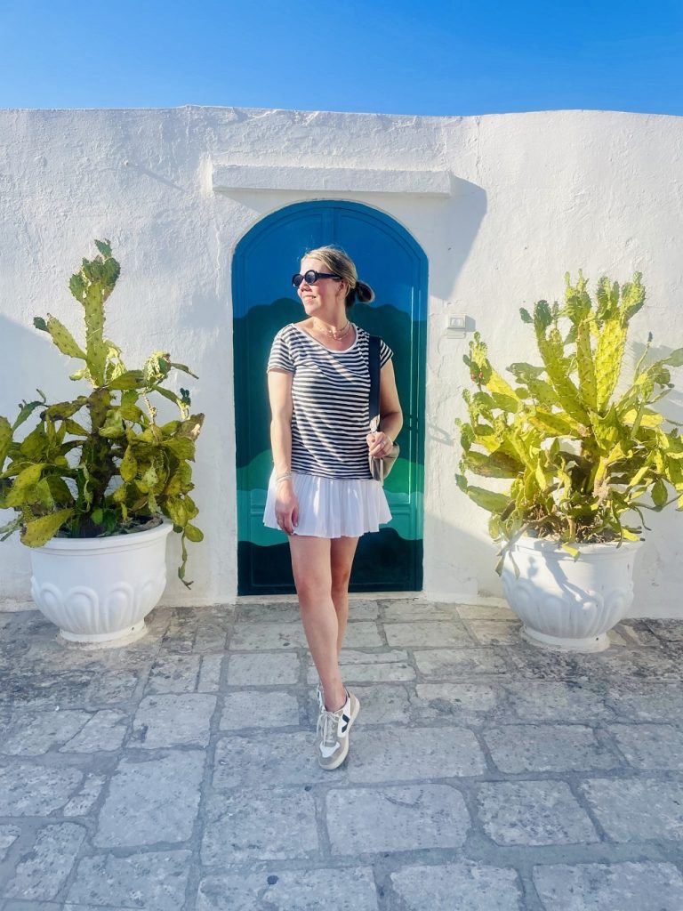 Also a Unesco World Heritage site worth visiting: the town of Alberobello, which is famous for its charming stone huts, called trulli. It’s another town where comfy shoes are a must, however I saw a bunch of women all decked out in heels and body-con dresses (so Italian!). I wore almost the exact same outfit in Positano a few days earlier, with a black tee instead of white; in both cases, I was super happy I brought my packable straw hat, because this hillside town was bright AF (in a good way, of course).