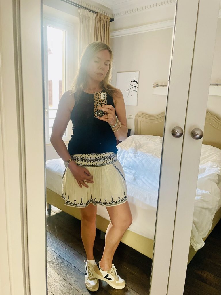 I almost never wear tank tops—it’s rarely warm enough for them in San Francisco, and my upper arms are not my best feature—but I’m happy to have them on hand for traveling, especially in summer. This skirt was very light and breathable (as you’ll see, it’s one of the few pieces I was able to wear multiple times), and my sneakers came in handy for the trek through Villa Borghese—I did over 20,000 steps on this day!