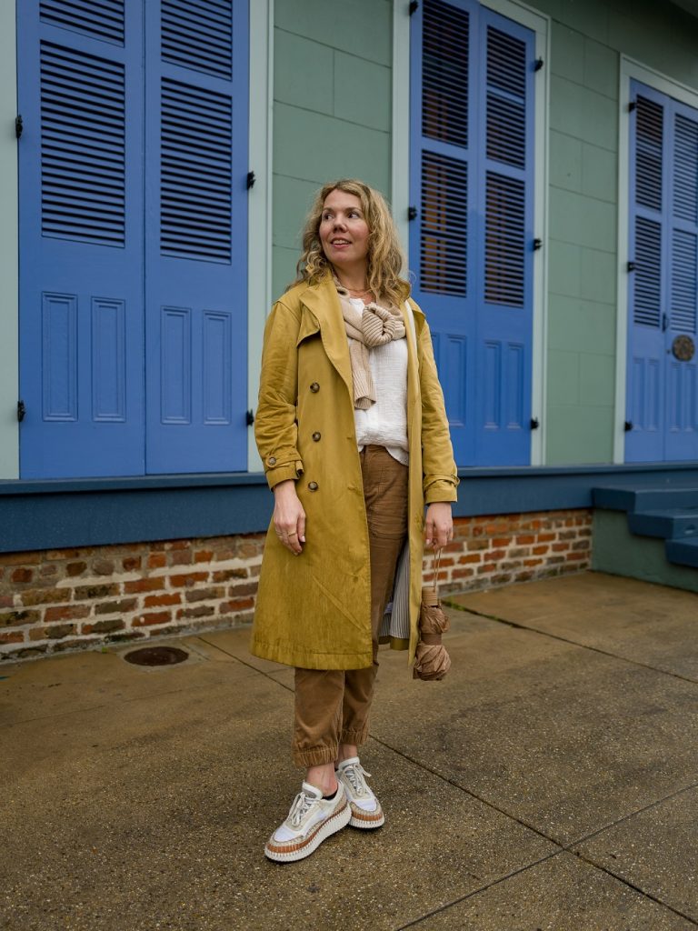 We were blessed with beautiful weather on the first two days; on our final day, it poured. This was romantic at first, then slightly annoying, and as the day went on and the city started to flood, fairly concerning. (Our hotel thankfully called a huge SUV to take us to the airport; if we were in a Prius or something like that, I don’t think we would have made it.) This was also a good reminder that New Orleans is basically on the edge of a swamp and is accordingly humid; as you can see, my hair responded by showing its true (curly!) nature. The trench coat I’m wearing here was not at all waterproof, and my pants got so soaked, I had to change into a skirt for the flight home. Still, totally worth it. Never a dull moment, and always an adventure! Pro trip: always bring an umbrella to New Orleans.