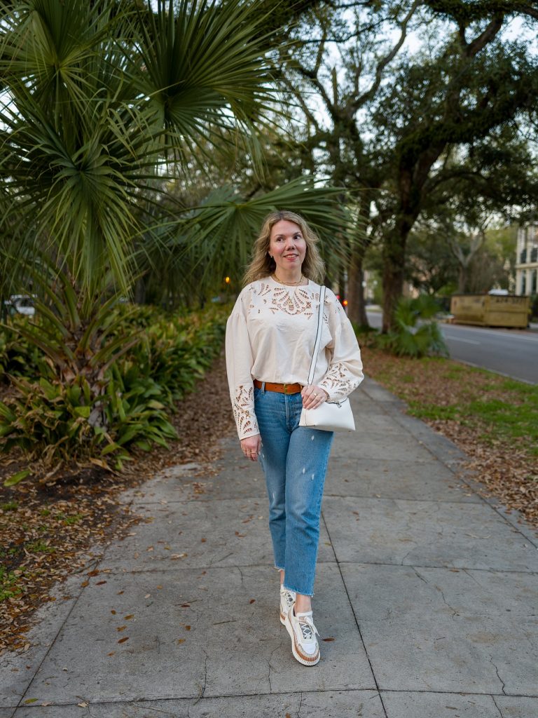 As I’ve said many times before, I am a sucker for a lacy white top. You last got a peek of this one in my favorite accessories post; again, it was so temperate in New Orleans that I was able to wear it without a jacket—and now you can see how amazing the sleeves are. I especially love wearing pretty white tops with jeans; Sean hates this pair, and now after seeing photos of them, I kind of agree. For some reason, my regular-length Levi’s 501s fit like a glove but the cropped version has kind of an anti-fit that doesn’t do me any favors. Off to the Poshmark pile they go!