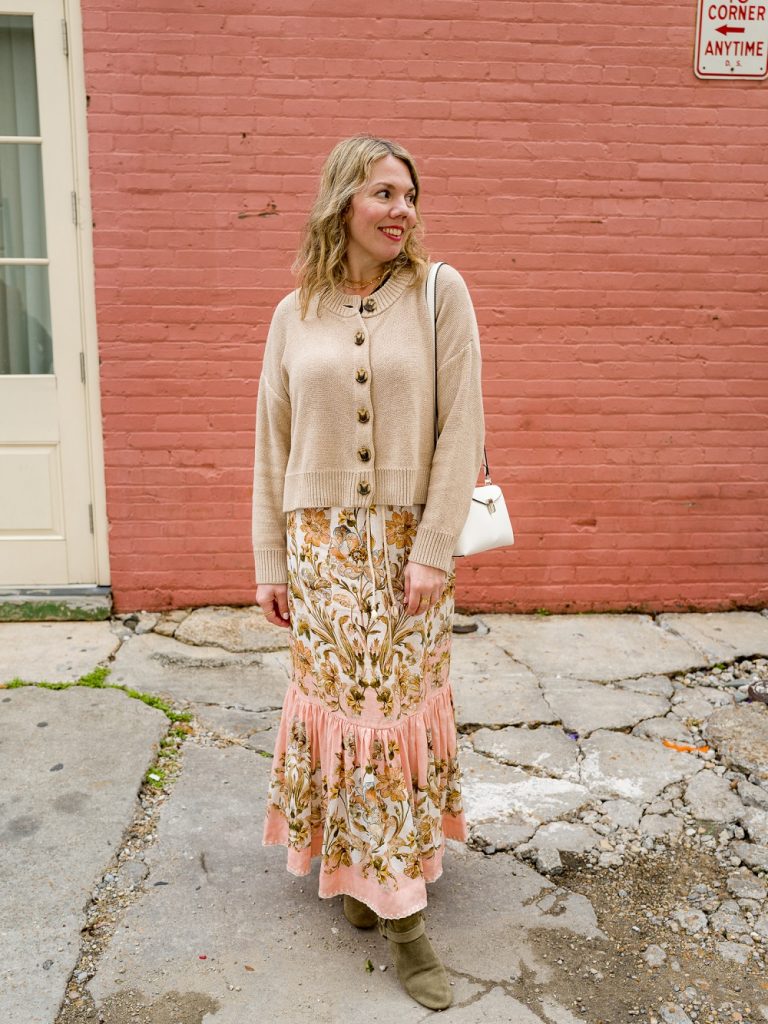 I was hoping for warmer weather but was not expecting it to be as warm as it was—during the day, I didn’t even need a jacket, which was such a novelty to me! I was comfortable in my cardigan, but the star of this outfit, of course, is the skirt. I feel like it’s not very “me,” but I fell in love with the print and it was on sale, so I decided to take a chance. I felt very pretty in it! I see what the hype is about with Zimmermann—people stopped me on the street to compliment it—and have a feeling this won’t be my last piece of theirs. The bag was a birthday present from my mom (thanks, mom!), and the boots are very old but very comfortable (and great on cobblestone streets). At night, I did need my wool shirt jacket, and I switched to sneakers because we were walking so much (like 20,000 steps a day!).