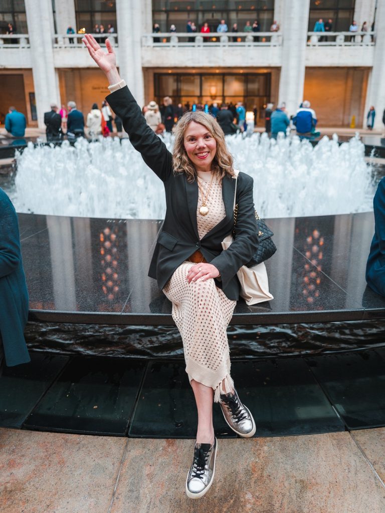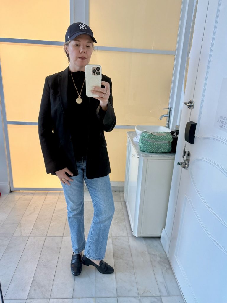 It was pouring rain again on this day, and while everyone kept remarking about how chilly it was, it was nowhere near as cold as when it rains in San Francisco, so I was able to get away with wearing just a blazer with a gauzy top underneath (I’ve worn this one before and it’s one of my favorites, however it doesn’t photograph anywhere near as beautifully as it looks in person). I was happy with my waterproof loafers even though they gave me a blister, however I would not recommend wearing jeans in such heavy rain—I had to go back to the hotel and blow-dry them before I went back out for dinner! Such a rookie move. But at least my Yankees cap made me feel like a local again.