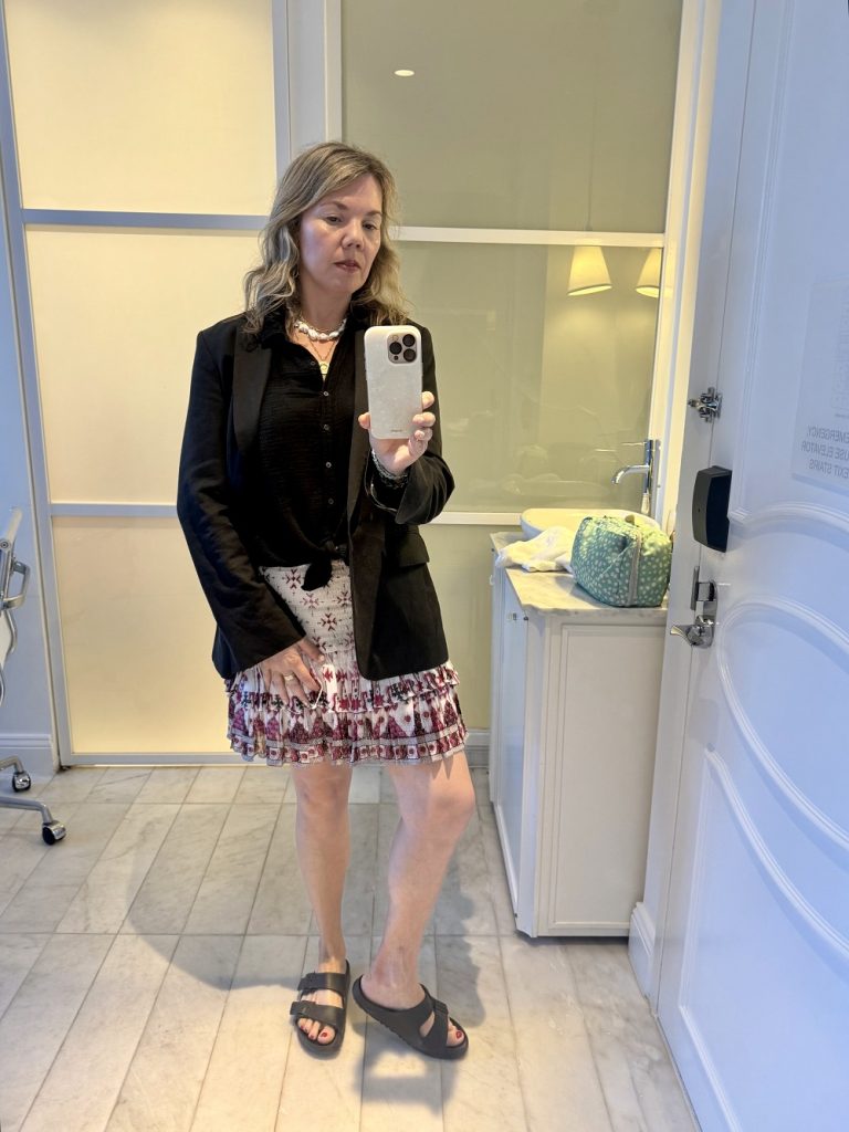 I scored this skirt at the Isabel Marant sample sale (it matches exactly with the top I’m wearing in this post!), which was happening literally right around the corner from our hotel, and I couldn’t wait to wear it—so I paired it with the black blazer I ended up wearing nearly every day of the trip and a black shirt to make it feel a little more polished. I spent most of the day shopping and later met up with a friend; while this outfit is very “me,” I felt a little out of place in Bergdorf Goodman, where everyone else was dripping in high-end designer everything. Again, I wish I had brought my Isabel Marant dad sandals, but otherwise I was happy with it.