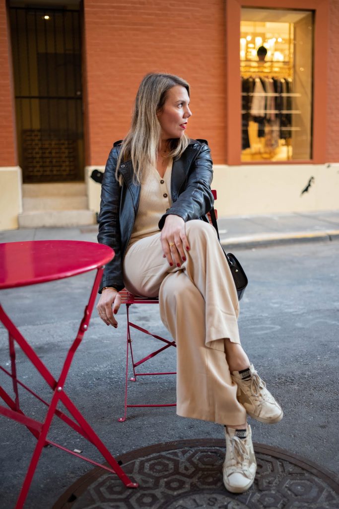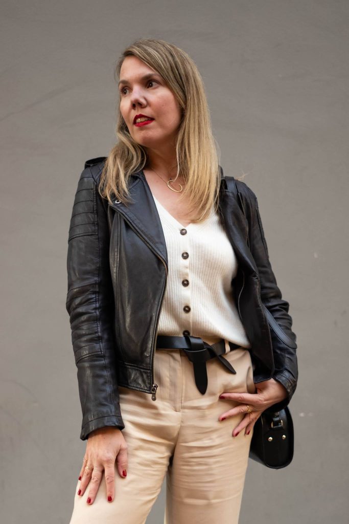 On my upper half, I’m wearing a very ’90s-inspired ribbed baby cardigan from last year (I wore it here for a holiday party—remember those?), and it’s so cropped that I normally struggle finding the right bottoms to wear with it, but since these trousers are so high-rise, the proportions are just right. This sweater is sadly sold out, but I’ve linked several very similar styles below. I had planned on wearing a different jacket with this outfit, but it looked a little too Annie Hall and hence my trusty Banana Republic black leather jacket was just right. I do kind of feel like I walked out of a Banana Republic ad circa 1994, but I think it works—it’s retro and yet timeless. You last saw this jacket 7 ways and, well, here’s yet another way to wear it!