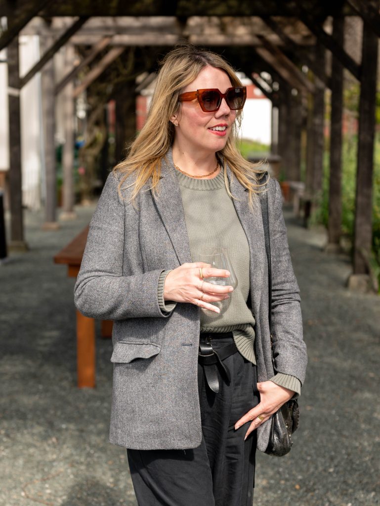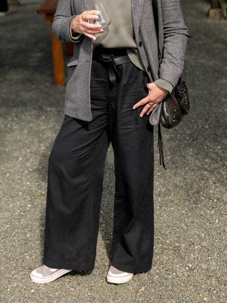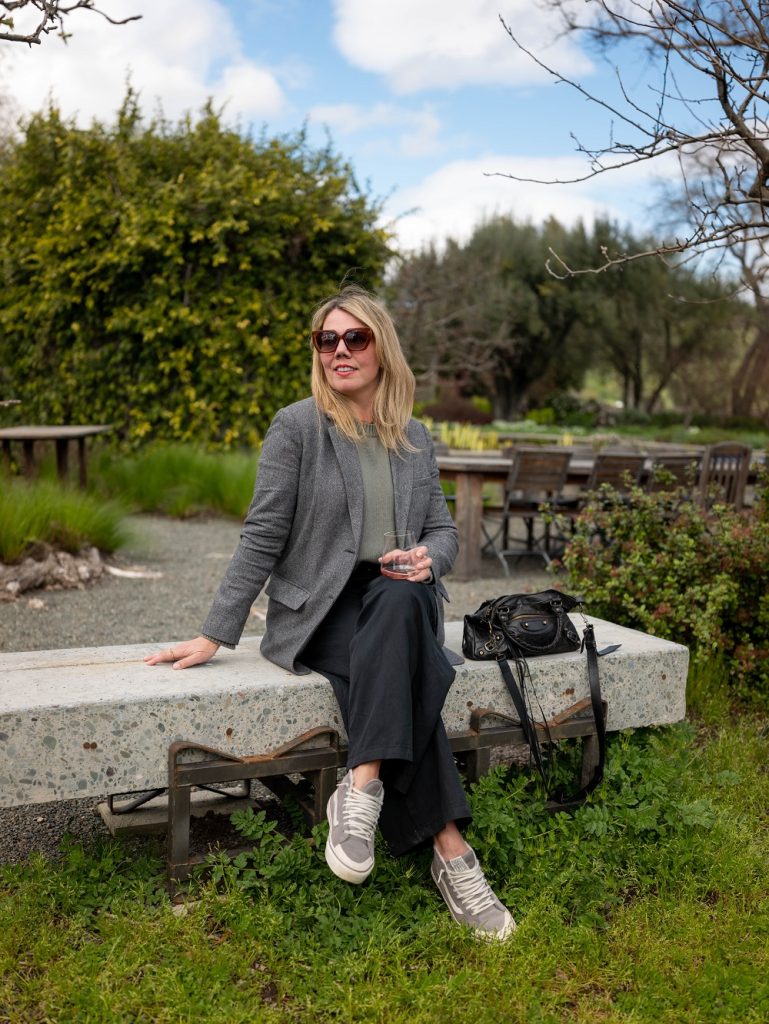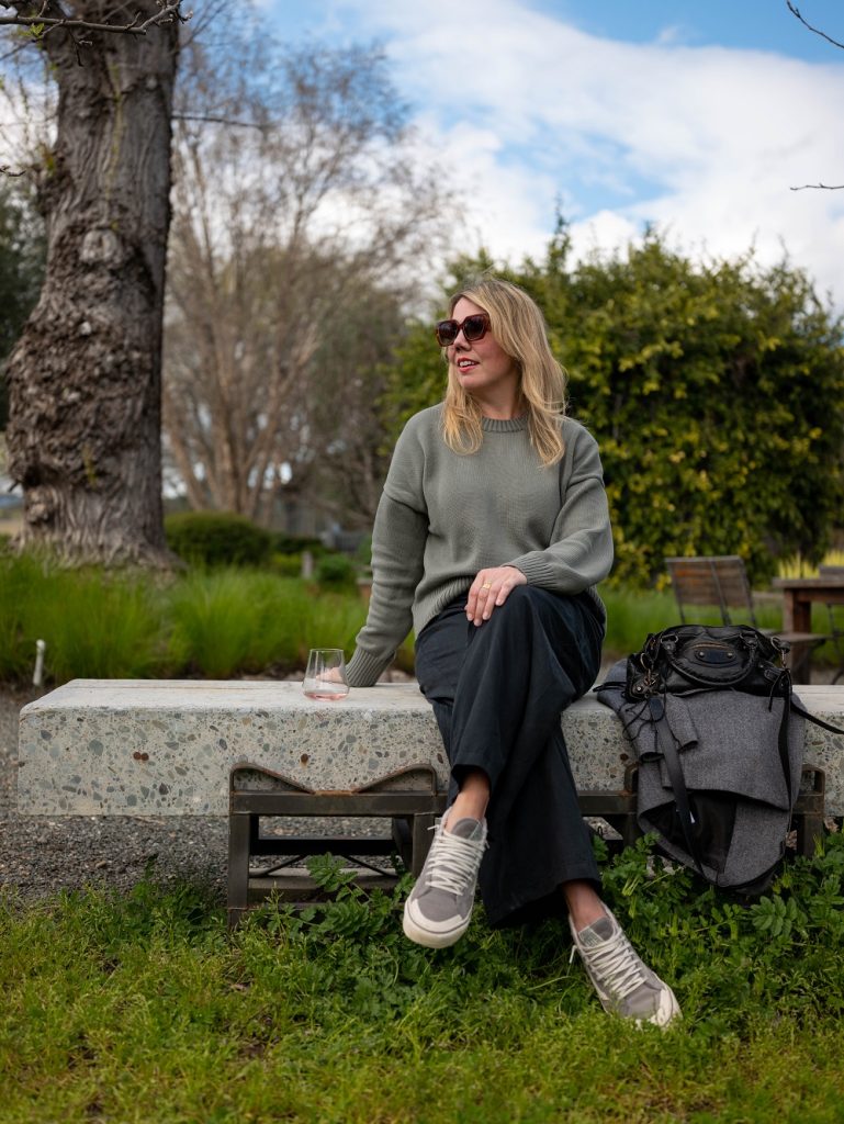 As I said earlier, I love these pants because you can wear any type of shoes with them; in this case, I went with sneakers because we were going to wine country (and it was still too cold for sandals). I love how dressed-down they make the outfit feel; if I had worn a heel, this would have definitely read more work vs. drinking wine. And purse-wise, anything would have gone here, but my 20-year-old(!) Balenciaga city bag has been a recent favorite—guess Y2K fashion is back for me after all!